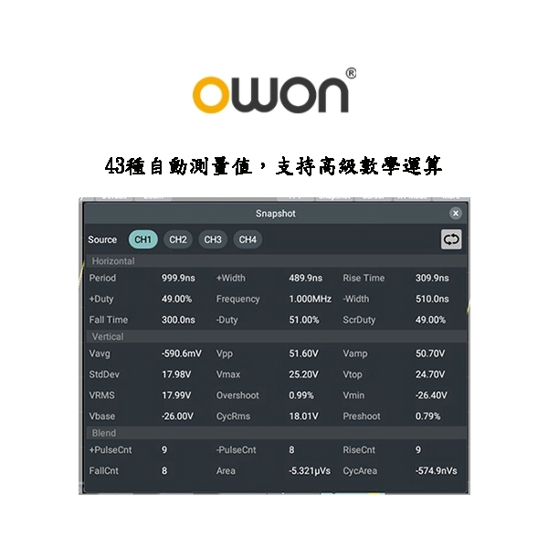 多達43種自動測量值,提供多種數學運算,內寘增强FFT分析和峰值搜索功能